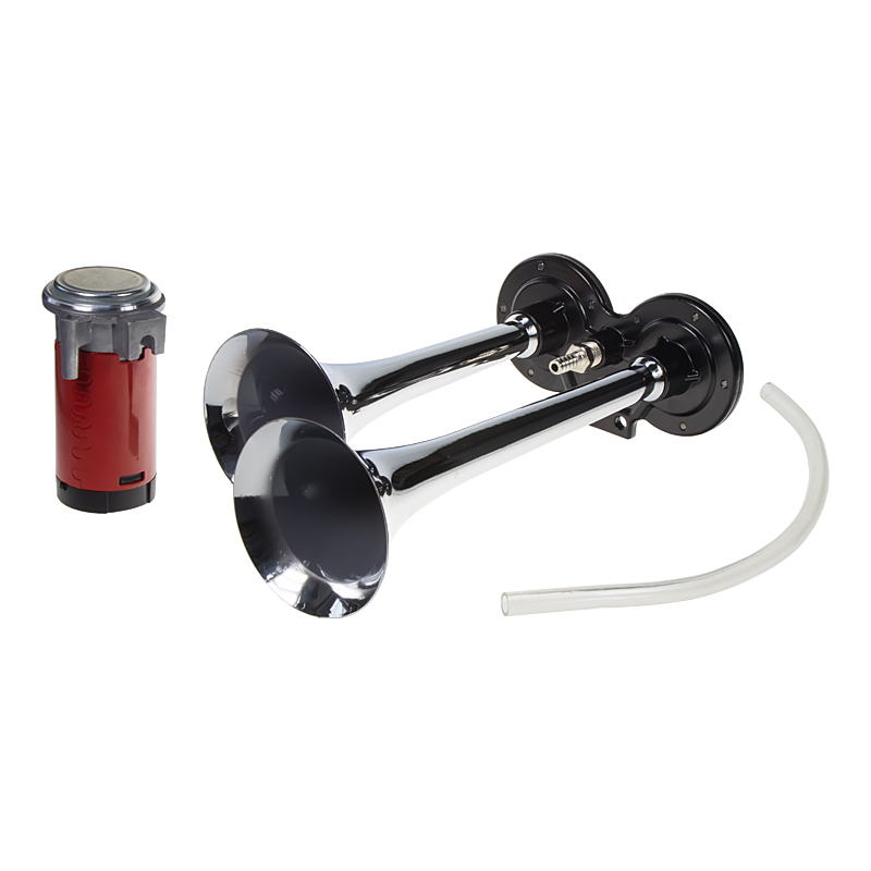 2-trubková fanfára poháněná vzduchovým kompresorem dodávaným v sadě.Trubky jsou pochromované. V sadě jsou dodávány také hadice a drobný montážní materiál.