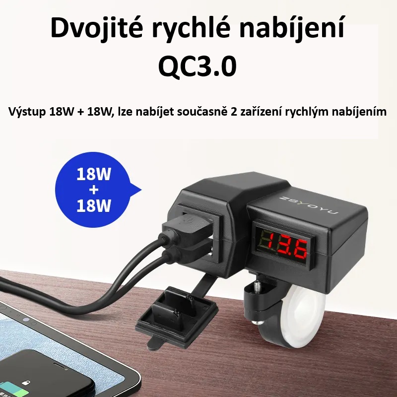 • DUÁLNÍ USB VÝSTUP: QC3.0 s podporou rychlého nabíjení (vhodné pro nabíjení mobilního telefonu, tabletu, fotoaparátu, iPhonu a GPS navigace)