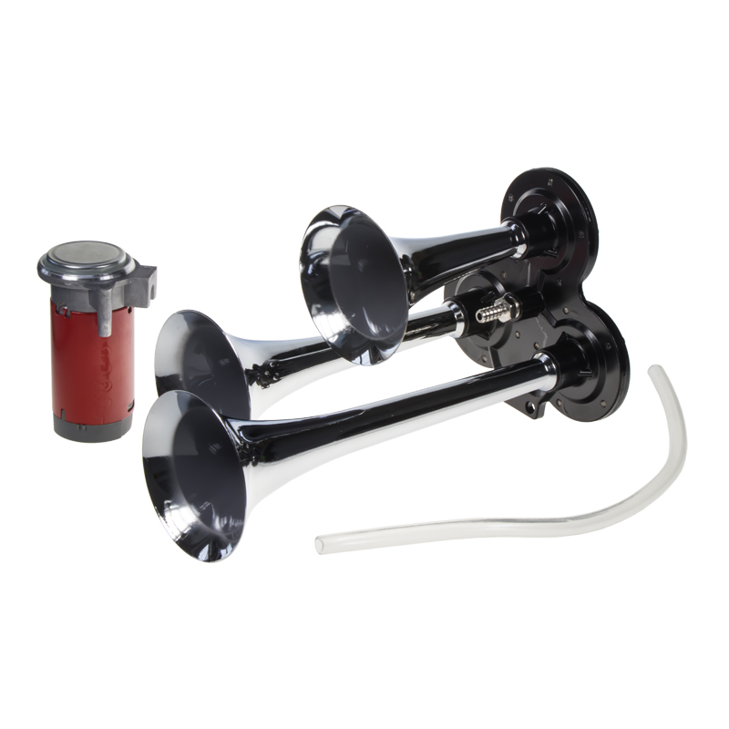 3-trubková fanfára poháněná vzduchovým kompresorem dodávaným v sadě.Trubky jsou pochromované. V sadě jsou dodávány také hadice a drobný montážní materiál.