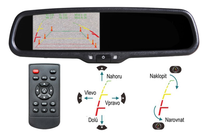 Monitor umístěný ve zpětném zrcátku slouží pro zobrazení obrazu z parkovací kamery nebo pro zobrazení obrazu DVD přehrávače. Zrcátko je umístěno na čelním skle na místě originálního zrcátka. Snadná instalace bez zásahu do interiéru automobilu.