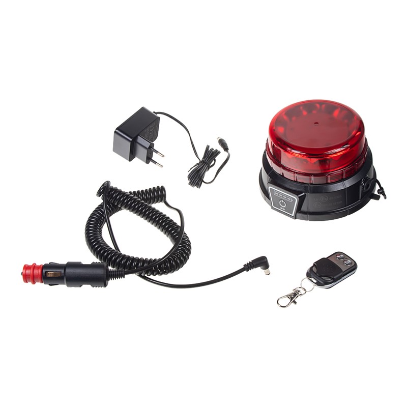 Akumulátorový nabíjecí výstražný červený maják s LED technologií a třemi režimy blikání a s možností ovládání pomocí dálkového ovladače. Určen pro uchycení pomocí magnetu.