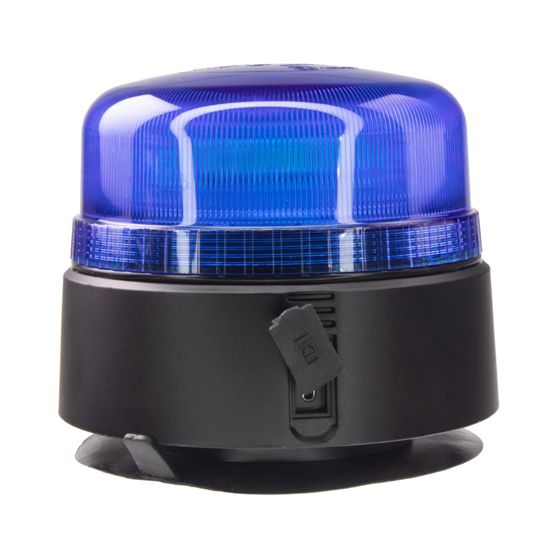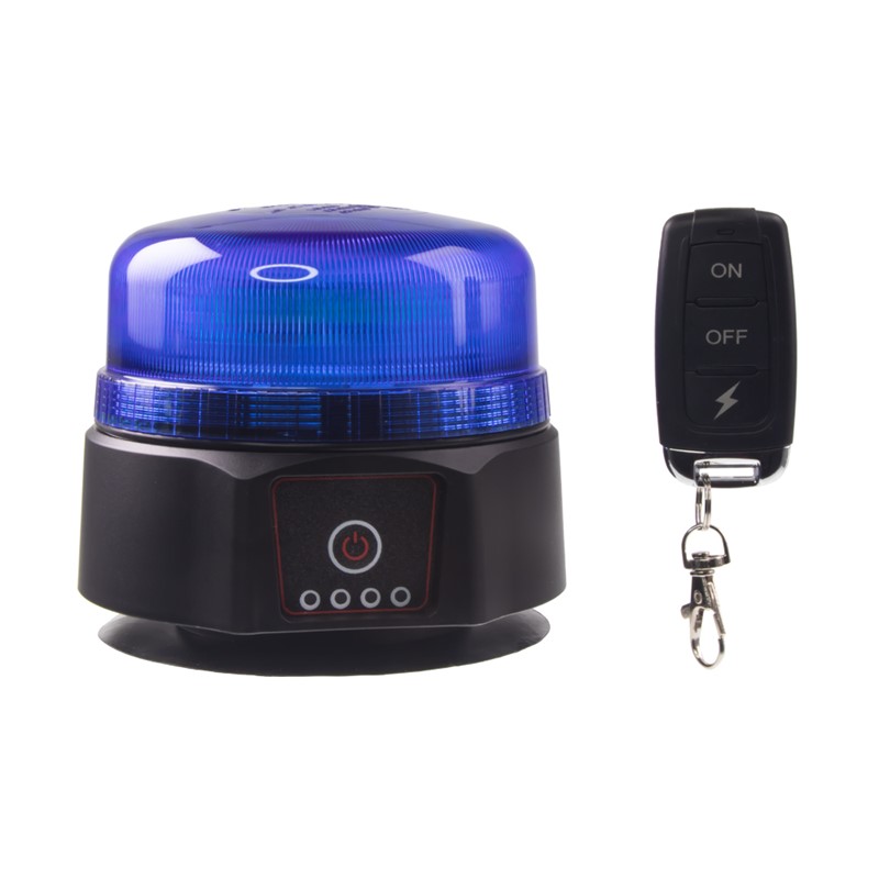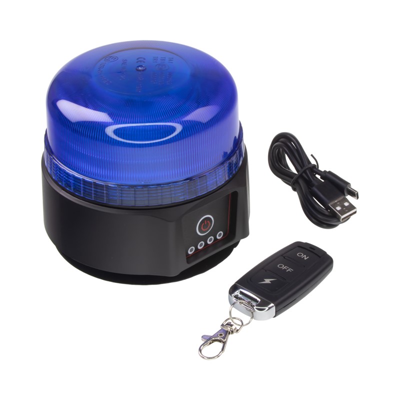 Akumulátorový nabíjecí výstražný modrý maják s LED technologií a 2 režimy blikání s možností ovládání pomocí dálkového ovladače. Určen pro uchycení pomocí magnetu.