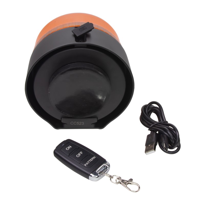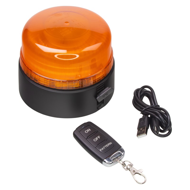 Akumulátorový nabíjecí výstražný oranžový maják s LED technologií a 2 režimy blikání s možností ovládání pomocí dálkového ovladače. Určen pro uchycení pomocí magnetu.