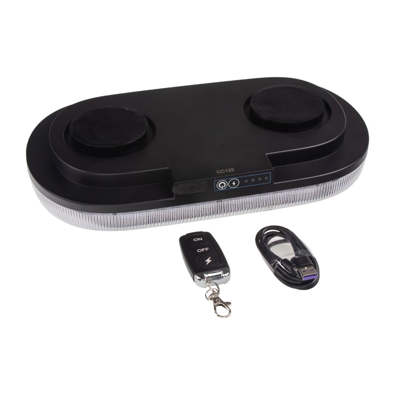 Akumulátorová nabíjecí miniaturní výstražná modročervená LED světelná rampa s různými režimy blikání a dálkovým ovladačem. Určena pro uchycení pomocí magnetu.