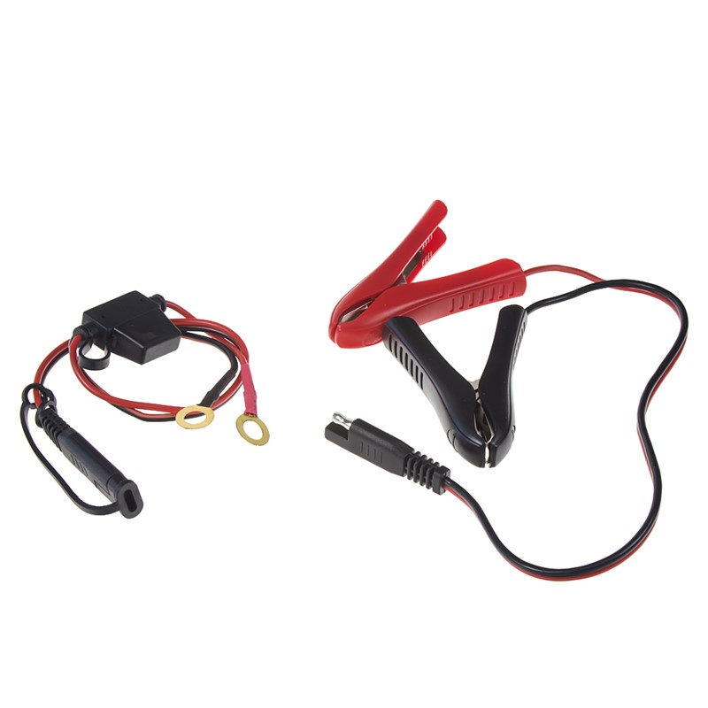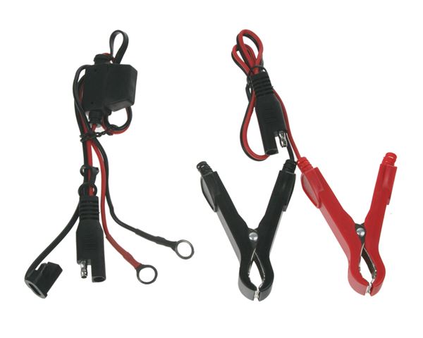 Součástí nabíječky jsou vyměnitelné nabíjecí koncovky: kabel s klešťovými svorkami, kabel s očky pro přímé připojení k baterii.