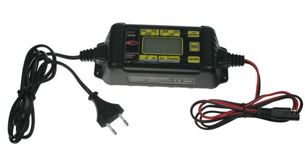 Inteligentní miniaturní nabíječka s informačním LCD, řízená mikroprocesorem pro olověné akumulátory a vestavěný testerem alternátoru a baterie.