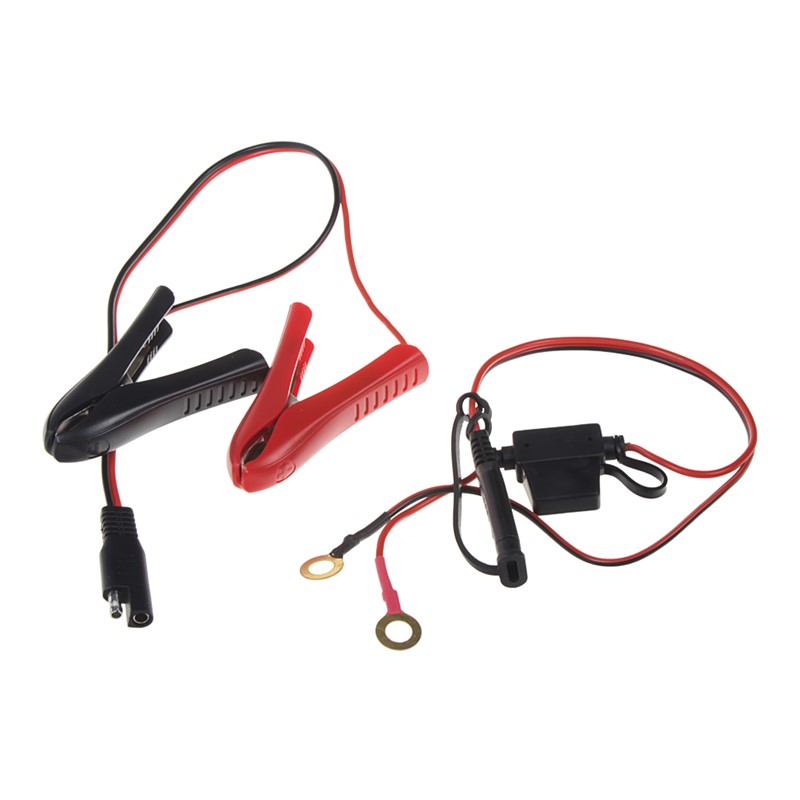 Součástí nabíječky jsou vyměnitelné nabíjecí koncovky: kabel s klešťovými svorkami, kabel s očky pro přímé připojení k baterii.