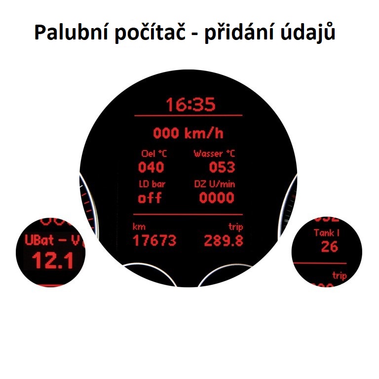 • DIS Přidání zobrazení následujících dat na displeji přístrojové desky (k dispozici pouze pro vozidla s červeným DIS): tlak turba v barech ( závisí na vozidle), teplota oleje v ºC/F, teplota vody v ºC/F, zbývající obsah paliva v L, rychlost v km/h - m/h, otáčky za minutu
