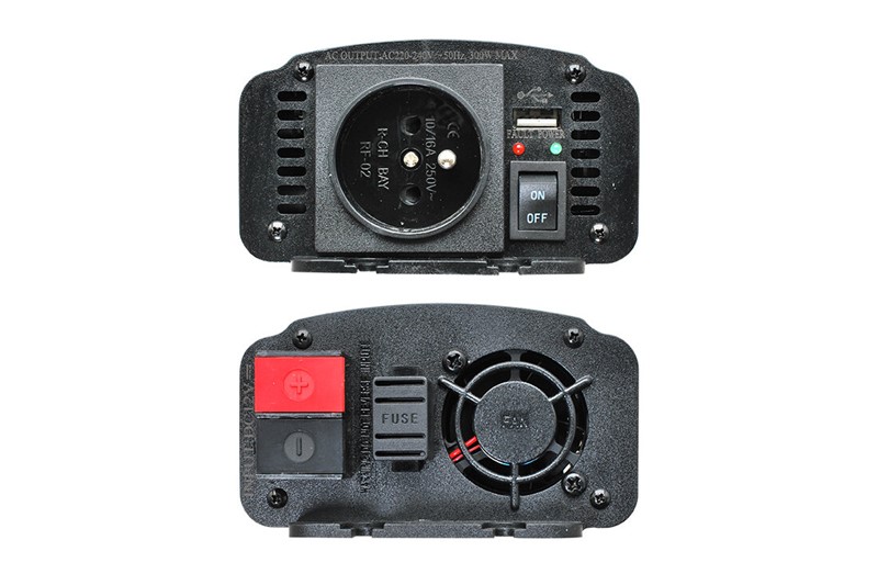 Vhodný provoz ledniček, příručního nářadí, světlometů atd. v automobilu. Připojuje se a napětí 12V do palubní sítě automobilu pomocí kabelů (součást dodávky). Výstupní napětí na zásuvce je 220V, trvalá zatížitelnost je 600W, špičkově 1200W. Chlazení ventilátorem.