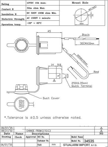 Krátký popis CL zásuvka do panelu.   Technické parametry: • napájecí napětí: 12 V • max. zatížení: 10 A • montážní otvor: ø 27,7 mm, hloubka 45 mm • krytka proti nečistotám • 2x vodič 300 mm
