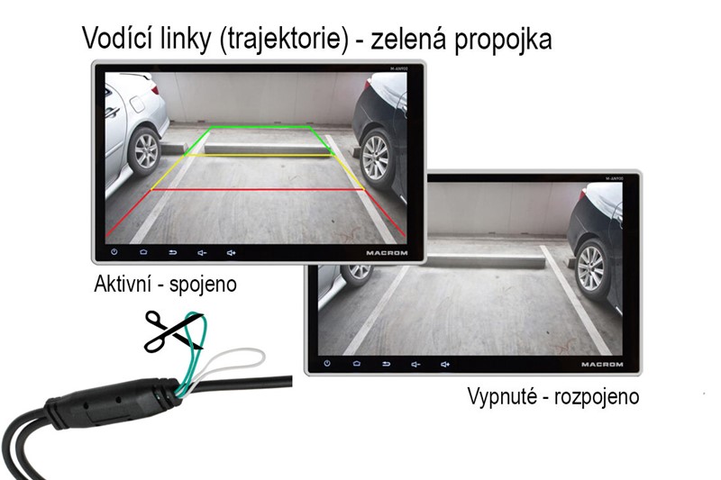 Kamera umožňuje zobrazení nebo skrytí trajektorií (vodících linek). Funkce je aktivní při spojené zelené smyčce v kabelovém svazku u kamery (výchozí nastavení - zobrazení vodících linek).