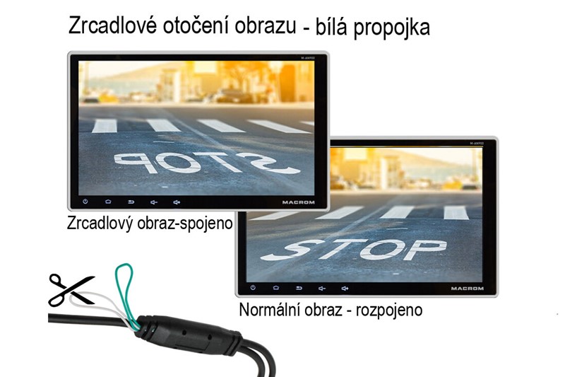 Kamera zobrazuje zrcadlový obraz, nutný pro použití jako zpětná parkovací kamera. Přerušením bílého vodiče v kabelovém svazku u kamery, je možné nastavit nezrcadlové zobrazení. (výchozí nastavení - zrcadlový obraz).