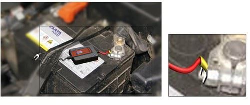 • červený terminál připojte na kladný pól baterie a černý na záporný pól baterie