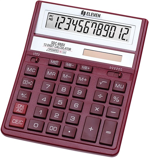 Stolní kalkulačka: 12 místný displej, 4 paměťové klávesy: MC, MR, M+, M-, Výpočet marže [MU], Odmocnina [?], Změna [+/-], Mazání, Desetinná čárka, Procenta [%], Zaokrouhlování, Dvojitá nula [00], Dvojí napájení: battery & solar