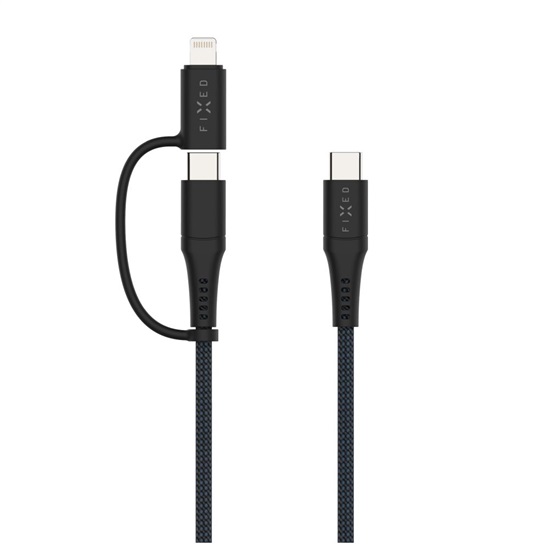 Dlouhý nabíjecí a datový opletený kabel FIXED s konektory USB-C/USB-C a Lightning adaptérem, PD, 2m, MFi, PD 60W, šedý
