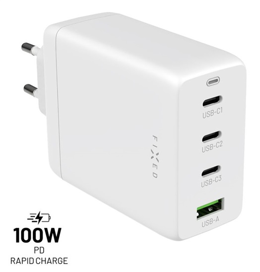 Krátký popis Síťová GaN nabíječka FIXED s 3xUSB-C a USB výstupem, podpora PD 3.0, 100W, bílá