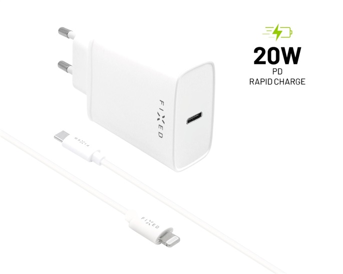 Set síťové nabíječky FIXED s USB-C výstupem a USB-C/Lightning kabelu, podpora PD, 1 metr, MFI, 20W, bílý se postará o rychlé a bezpečné nabíjení vašeho moderního smartphonu, tabletu nebo jiné elektroniky.