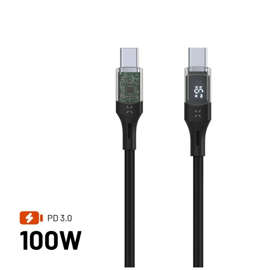 Nabíjecí a datový kabel FIXED s displejem s konektory USB-C/USB-C a podporou PD, 2m, USB 2.0, 100W, černý