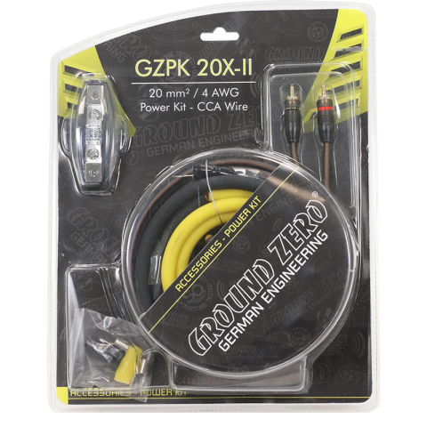 20mm² napájecí set: 5,2m plusový kabel 20mm²/ 4 AWG (žlutý) 0,8 m minus kabel 20mm²/ 4 AWG (černý) 5m 3x stíněný RCA kabel (GZCC 5.3X) s  remote kabelempojistkové pouzdro s mini-ANL 80A pojistkoumontážní příslušenství