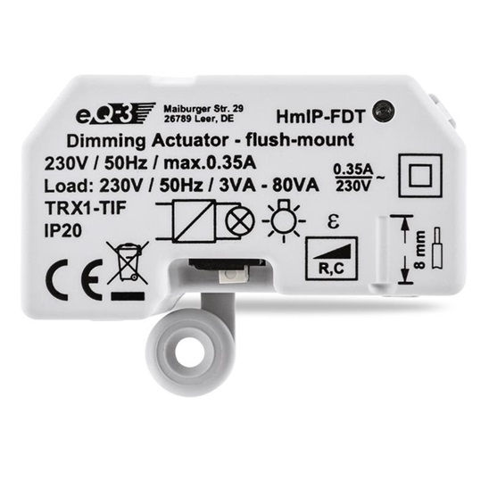 Krátký popis Stmívací akční člen - skrytá montáž HmIP-FDTProgramovatelný bezdrátový Stmívací akční člen (HmIP-FDT) pro skrytou montáž, napájený ze sítě 230 V.Zařízení je předurčeno pro ovládání světelných okruhů, ale může spínat a regulovat i jiná zařízení splňující