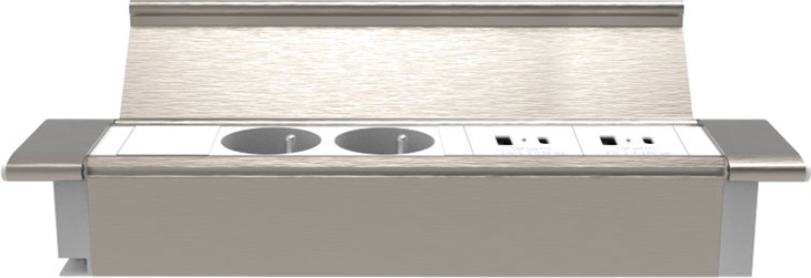 Tento blok se 2 zásuvkami a 2 sadami USB portů A+C diskrétně zapadne do pracovní desky v kuchyni nebo kanceláři. Jedná se o vestavný systém.Tělo: plast + leštěná ocel.Vyžaduje vrtání otvoru na desce děrovací pilou nebo vykružovacím nástrojem, montážní rozměry otvorů: 260 x 50 mm