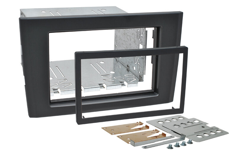 Obsah balení: plastový adaptér, vymezovací rámeček 2DIN, kovový rámeček, instalační materiál