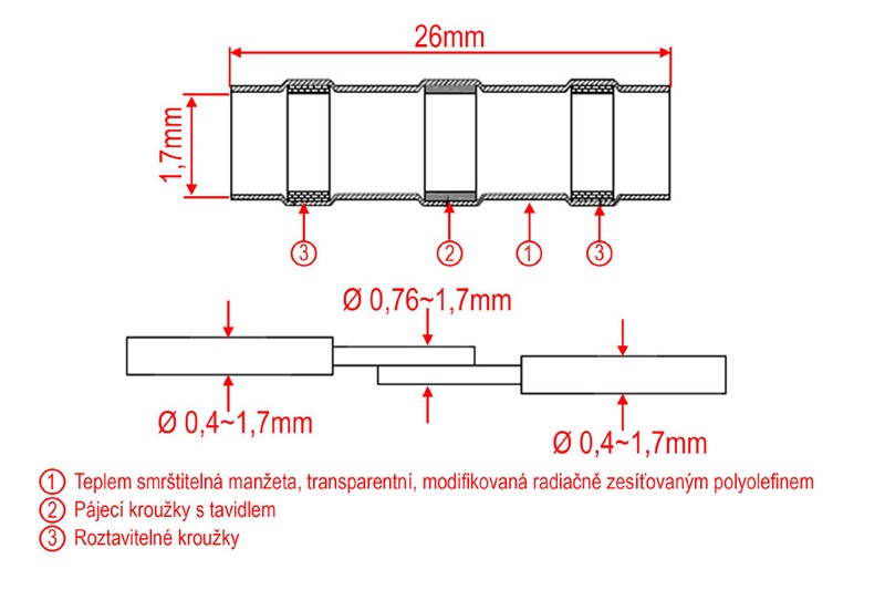 Letovací spojovací trubička pro kabel 0,25~0,5mm izolované teplem smršťovací bužírkou s lepidlem