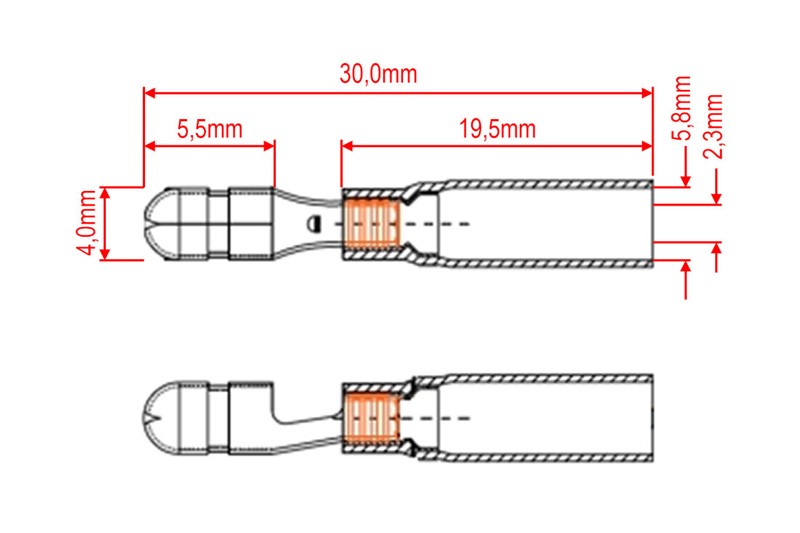 Izolovaný konektor faston - samec plochý Ø4mm izolovaná teplem smrštitelnou trubicí s lepidlem.