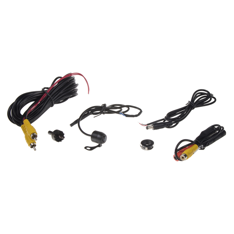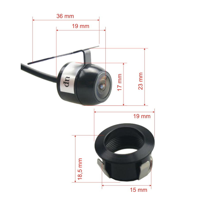 Miniaturní CCD barevná kamera určená pro zavrtání nebo vnější montáž nejlépe nad zadní registrační značku vozidla. Kamera volitelně zobrazuje pomocné trajektorie pro parkování.