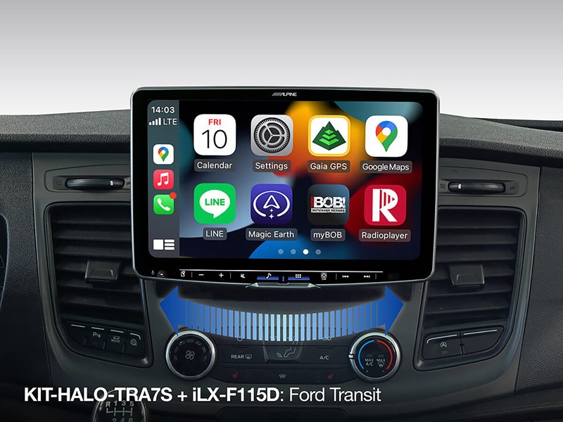 • Sada KIT-HALO-TRA7S obsahuje rozhraní CAN na UART, které obsahuje podporu tlačítek dálkového ovládání na volantu (nejnovější datový protokol včetně podpory SIRI a OK Google). Obsahuje také kabelový svazek plug-and-play pro snadné připojení jednotky Alpine k vozidlu Ford, adaptér kabelu kamery (Alpine direct - RCA), adaptér antény a adaptér USB. Kabelový svazek umožňuje snadný přístup k signálu zapalování, signálu rychlosti a zpětnému signálu ze sběrnice CAN.