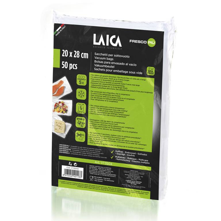 Krátký popis Sáčky do vakuovačky 50 kusů • rozměr 20 × 28 cm • 4vrstvové • tloušťka 90 μm • kompatibilní se všemi vakuovačkami • vyrobeno v Itálii • vhodné do mrazáku i na Sous Vide vaření