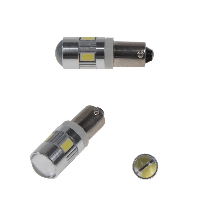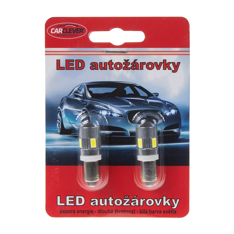 Náhradní LED žárovka s paticí BA9s, 6x super svítivá SMD LED 5730 , vhodná do parkovacích světel u novějších vozidel, odpovídá žárovce "celosklo" W5W. Svítivost LED diody je podstatně větší než u žárovky 12 V 5 W. Díky teplotě světla 6000 K jsou LED žárovky ideálním doplňkem do reflektorů s xenonovými výbojkami, kde žluté světlo obyčejné žárovky působí rušivě.