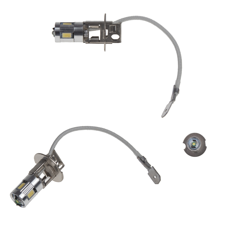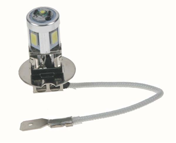 Nová generace LED autožárovek s paticí H3, bílá, zepředu 1x super svítivý LED čip OSRAM 3 W, z boku 4 SMD LED Samsung.