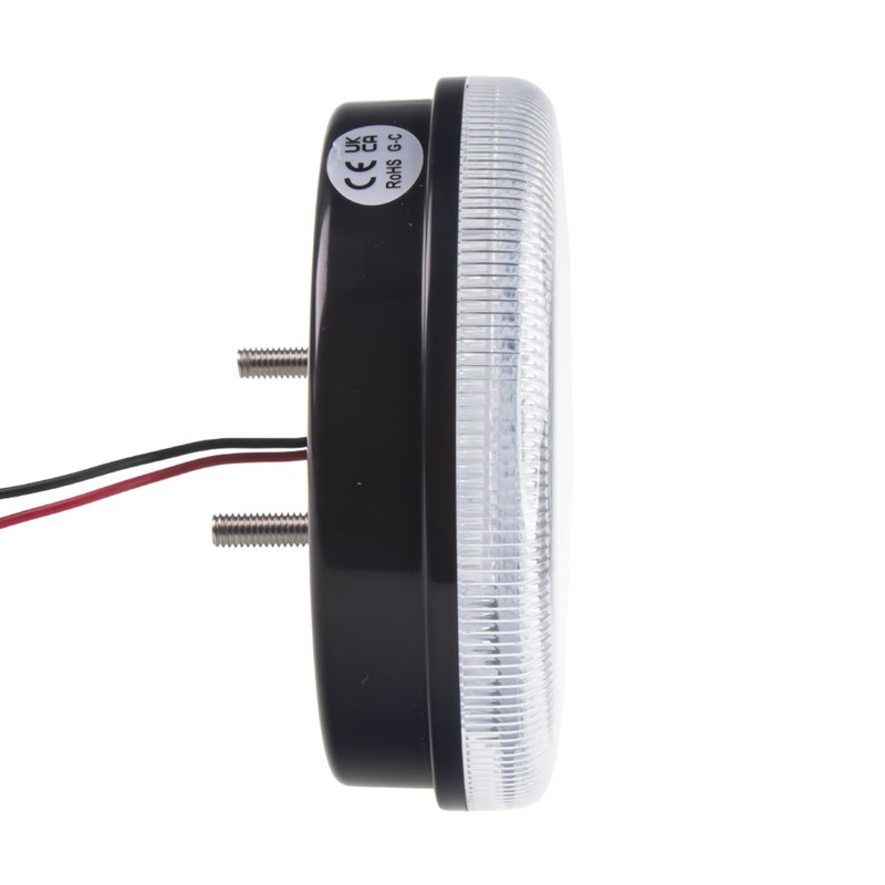 Krátký popis Lampa zadní couvací - LED, kulatá, bílé světlo   Technické parametry • napájení 12/24 V • homologace ECE R23, R10 • světelný zdroj: 24x 0,2W LED • rozměry: ø 122 x 40 mm • rozteč montážních otvorů 45 mm • délka připojovacích vodičů: 260 mm • vodotěsné IP67 • materiál: plast ABS/PMMA • pracovní teplota: -40⁰C - +65⁰C   Připojení vodičů • černý vodič - zem • červený vodič - couvací světlo