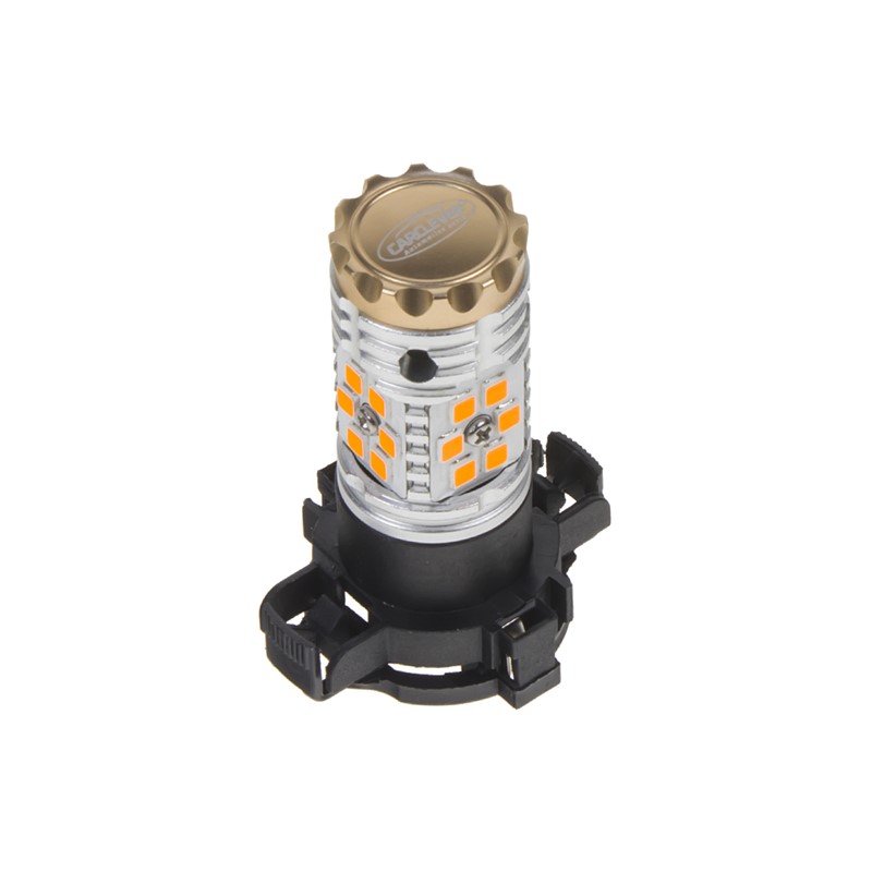 Nová generace LED autožárovek s paticí PY24W, oranžová, 24x LED čip 3030SMD. Díky speciální vestavěné elektronice simuluje stejný odběr jako klasická žárovka a nehlásí chybu ve vozidlech se systémem hlídání prasklých žárovek. Určeno do směrových světel (blinkrů), žárovky blikají správnou rychlostí.