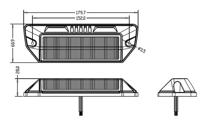 • rozměry: výška 60 mm, šířka 179 mm, hloubka 28 mm, rozteč upevňovacích šroubů 152 mm