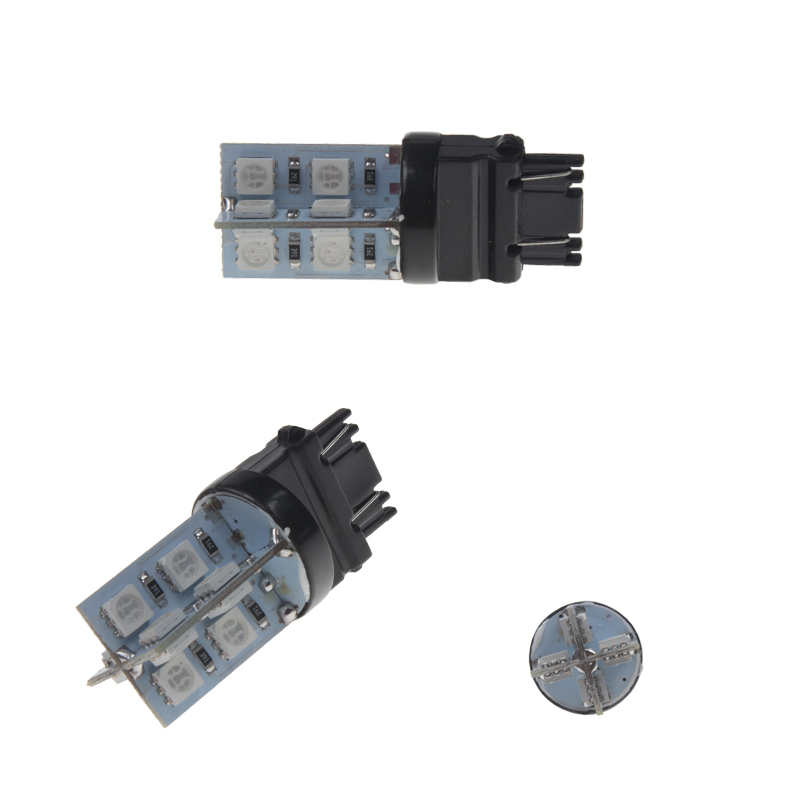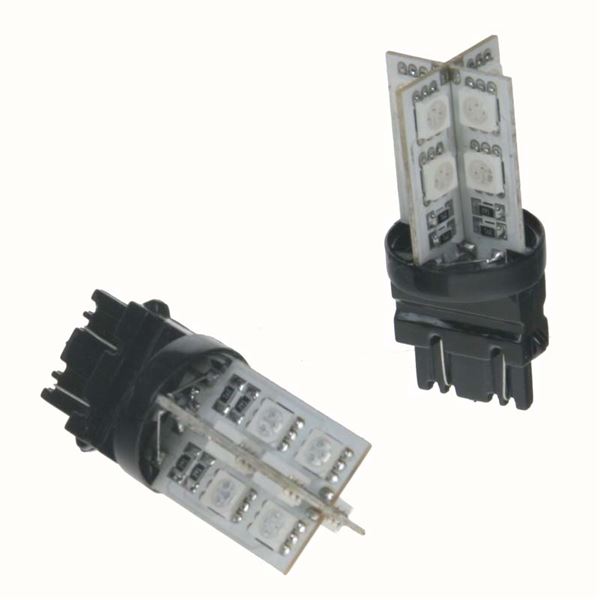 Náhradní červená LED žárovka s paticí T20 (3157 - W2,5x16d ), bílá, s vestavěným rezistorem ( nehlásí závady řídící jednotky na žárovce u nových vozidel), 16x vysocesvítivé 3-čipové SMD LED diody. Tato žárovka se používá především v automobilech dovezených z USA automobilky Dodge, Ford, Chrysler.