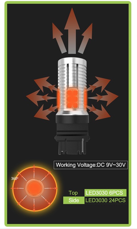Nová generace LED autožárovek s paticí T20 7440, oranžová, 30x LED čip 3030SMD.