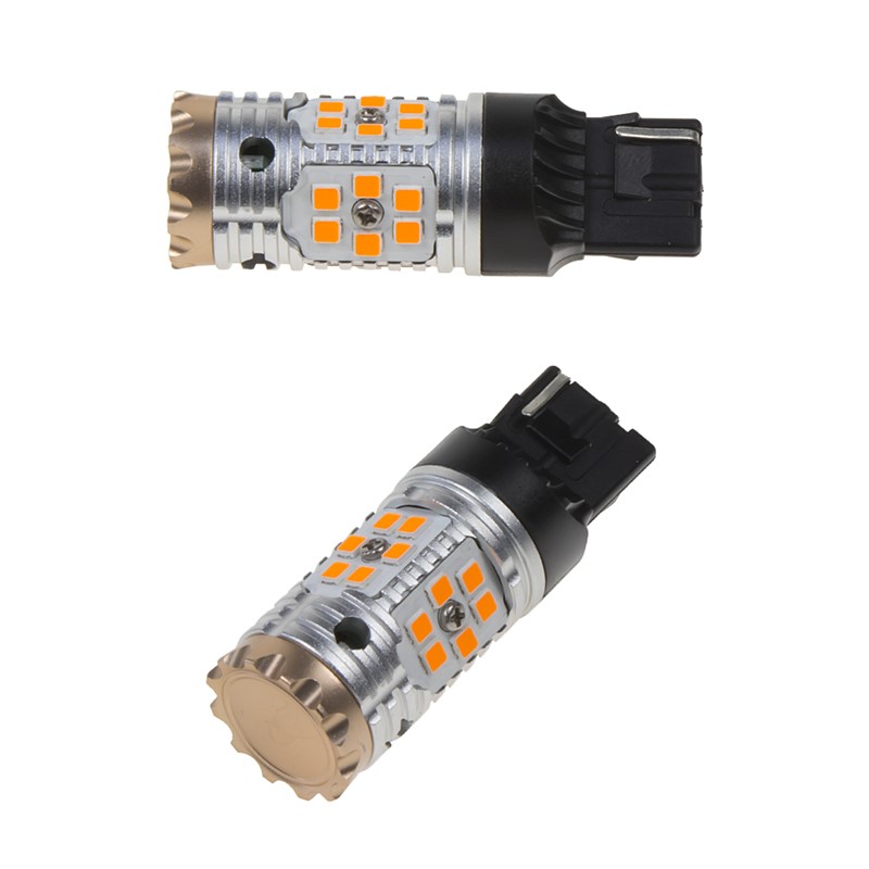 Nová generace LED autožárovek s paticí T20 (7440), oranžová, 24x LED čip 3030SMD. Díky speciální vestavěné elektronice simuluje stejný odběr jako klasická žárovka a nehlásí chybu ve vozidlech se systémem hlídání prasklých žárovek. Určeno do směrových světel (blinkrů), žárovky blikají správnou rychlostí.