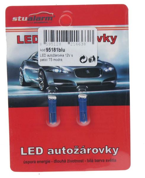 Náhradní LED žárovka s paticí T5 modrá, 1x 3-čipová SMD LED, použití např. do přístrojových desek.
