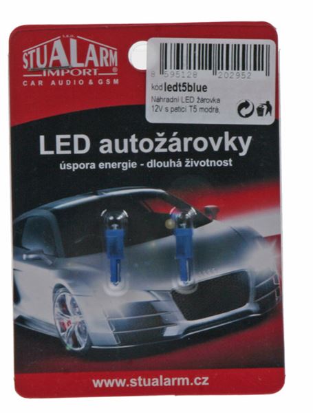 Náhradní LED žárovka s paticí T5 modrá, 1LED, použití např. do přístrojových desek.   Technické parametry - patice T5 - barva modrá - 1LED - velmi dlouhá životnost (až 50 000 h) - odolné otřesům, častému zapínání a vypínání - napájecí napětí 12 V - minimální odběr proudu - cena za ks, balení 2 ks (pár)   Vlastnosti - vynikající do vozidel, kde dochází k častému praskání klasických žárovek - pro všechny osobní vozy, dodávky a motocykly s palubním napětím 12 V - vysoká svítivost