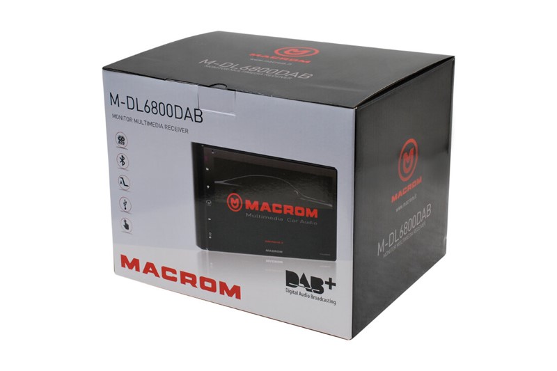 Multimediální přehrávač s 6,8“ kapacitním displejem, DAB+ tunerem, a Bluetooth hands Free sadou s externím mikrofonem.