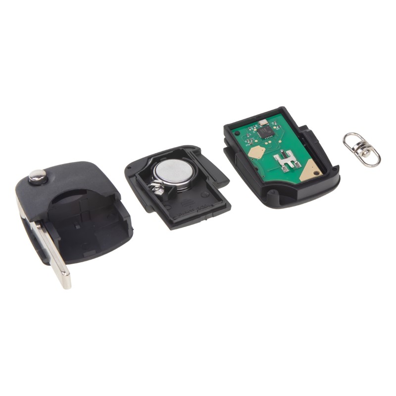 Náhradní vystřelovací autoklíč s dálkovým ovladačem pro vozy koncernu VW - originál. Součástí klíče je dálkové ovládání centrálního zamykání se dvěmi tlačítky a čip pro imobilizér. Planžetu klíče je třeba přendat z původního klíče nebo nechat vyfrézovat podle tvaru originálního klíče, vyřezaný klíč s čipem je nutno naprogramovat do řídící jednotky vozu a dálkové ovládání je třeba spárovat s komfortní jednotkou vozu.