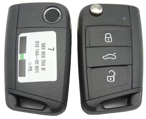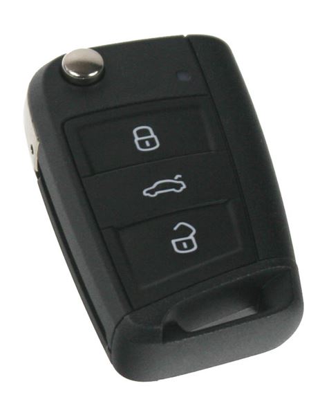 Náhradní vystřelovací autoklíč s dálkovým ovladačem pro vozy koncernu VW - originál. Součástí klíče je dálkové ovládání centrálního zamykání se třemi tlačítky a čip pro imobilizér. Planžetu klíče (není součástí klíče) je třeba přendat z původního klíče nebo nechat vyfrézovat novou podle tvaru originálního klíče, vyřezaný klíč s čipem je nutno naprogramovat do řídící jednotky vozu a dálkové ovládání je třeba spárovat s komfortní jednotkou vozu.