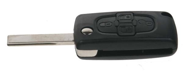 Náhradní vystřelovací autoklíč s dálkovým ovladačem pro vozy Peugeot / Citroën. Součástí klíče je planžeta, dálkové ovládání centrálního zamykání se 4-mi tlačítky a čip ID 46 pro imobilizér. Náhrada originálního ovladače.