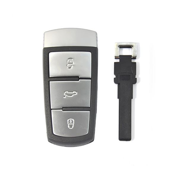 Náhradní autoklíč s dálkovým ovladačem pro vozy koncernu VW. Součástí klíče je planžeta, dálkové ovládání centrálního zamykání se třemi tlačítky a čip ID 48 pro imobilizér. Planžetu klíče je třeba nechat vyfrézovat podle tvaru originálního klíče, vyřezaný klíč s čipem je nutno naprogramovat do řídící jednotky vozu a dálkové ovládání je třeba spárovat s komfortní jednotkou vozu.