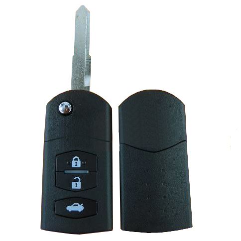 Náhradní obal vystřelovacího klíče pro vozy Mazda s 3-tlačítkovým ovladačem (bez elektroniky a čipu imobilizéru). Do klíče je nutno vložit z původního klíče elektroniku dálkového ovládání a čip imobilizéru (transpondér), planžetu klíče je třeba nechat vyfrézovat podle tvaru originálního klíče.
