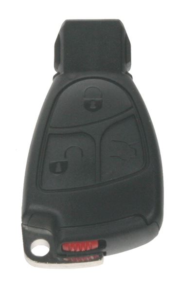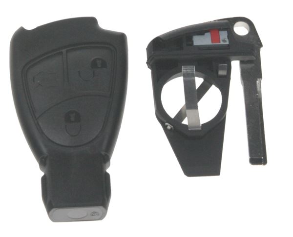 Náhradní obal klíče pro vozy Mercedes s 3-tlačítkovým ovladačem (bez elektroniky a čipu imobilizéru), včetně držáku baterie. Do klíče je nutno vložit z původního klíče elektroniku dálkového ovládání a čip imobilizéru (transpondér), planžetu klíče je třeba nechat vyfrézovat podle tvaru originálního klíče.