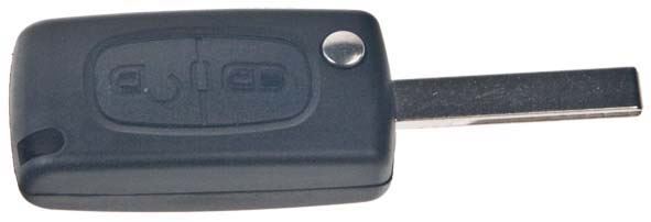 Náhradní obal vystřelovacího klíče pro vozy koncernu Peugeot s 2-tlačítkovým ovladačem (bez elektroniky a čipu imobilizéru). Planžeta klíče HU83, baterie je umístěna přímo na plošném spoji ovladače. Do klíče je nutno vložit z původního klíče elektroniku dálkového ovládání a čip imobilizéru (transpondér), planžetu klíče je třeba nechat vyfrézovat podle tvaru originálního klíče.