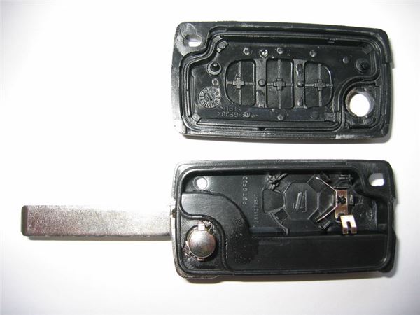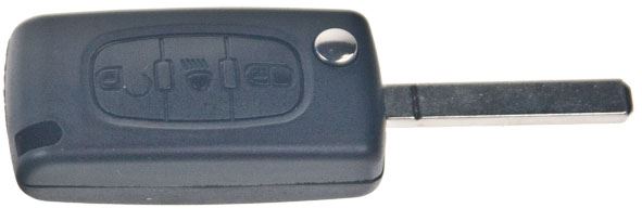 Náhradní obal vystřelovacího klíče pro vozy koncernu Peugeot s 3-tlačítkovým ovladačem (bez elektroniky a čipu imobilizéru) a se světlem. Planžeta klíče VA2, baterie je umístěna v plastovém krytu ovladače. Do klíče je nutno vložit z původního klíče elektroniku dálkového ovládání a čip imobilizéru (transpondér), planžetu klíče je třeba nechat vyfrézovat podle tvaru originálního klíče.
